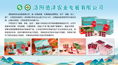 洛阳德泽农业发展有限公司位于河南省洛阳市伊川县的洛阳德泽农业发展有限公司,是一家有机树莓种植、加工与销售的现代农业企业,是“国家级生态农场”和“河南省农业产业化重点龙头企业”。其有机树莓认证面积167亩,实行“有机种植+生态旅游+深加工”三产融合模式,年产树莓约300吨,有机种植区总产值约2000万元。多次参加有机食品博览会,进一步提升在全国影响力和知名度,推动树莓成为洛阳特色农业产业的一张亮丽名片,积极助力乡村振兴。